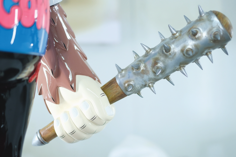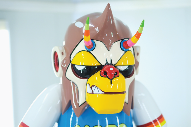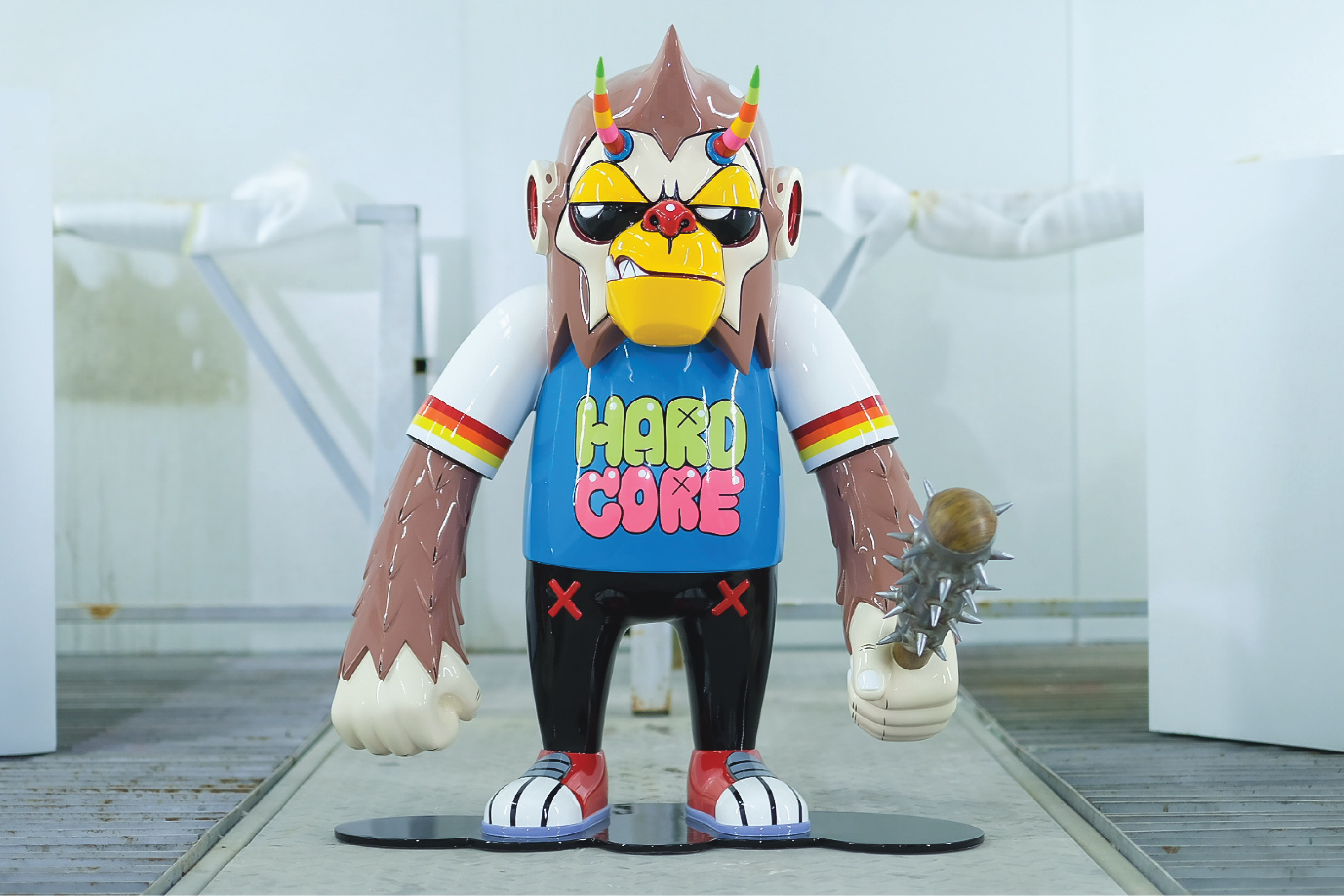 This sculpture is typically created as a Fiber Art Toy Painting which is a contemporary style by P7. That was designed as a special series called "The Iron Head Gang 2020.", which consist of 3 members of the gang as the first member called “HARDCORE MONKEY”, second member called “THE MOTOR PANDA” and the last one called “HEAVY RABBIT THE”.